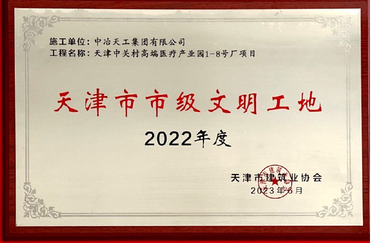 2023-117天津中关村高端医疗产业园1-8号厂项目2022年度天津市市级文明工地(牌匾)