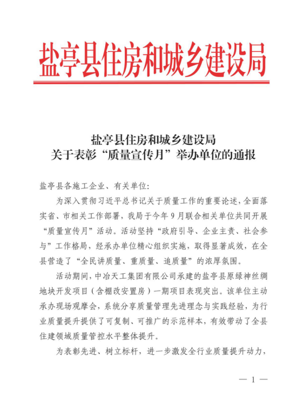 近日,南方公司承建的四川省綿陽(yáng)市鹽亭縣原綠神絲綢地塊開(kāi)發(fā)項(xiàng)目憑借卓越的質(zhì)量管理成效、創(chuàng)新的實(shí)踐經(jīng)驗(yàn)及廣泛的行業(yè)示范作用,榮獲鹽亭縣住房和城鄉(xiāng)建設(shè)局通報(bào)表彰。