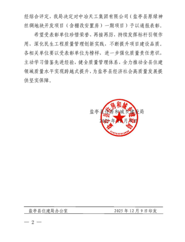 榮譽(yù)在肩,責(zé)任在身。項(xiàng)目部將以此次通報(bào)表彰為契機(jī),再接再厲、精益求精,持續(xù)發(fā)揮標(biāo)桿引領(lǐng)作用,深化民生工程質(zhì)量管理創(chuàng)新實(shí)踐,不斷提升項(xiàng)目建設(shè)品質(zhì)。同時(shí),將積極分享質(zhì)量管理經(jīng)驗(yàn),與行業(yè)同仁攜手共進(jìn),助力屬地住建領(lǐng)域質(zhì)量管控水平有效提升,以實(shí)際行動(dòng)踐行企業(yè)社會(huì)責(zé)任,為鹽亭縣經(jīng)濟(jì)社會(huì)高質(zhì)量發(fā)展貢獻(xiàn)“天工力量”!