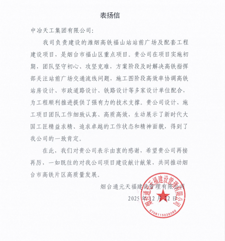 近日,工程技術總院濰煙高鐵福山站站前廣場及配套工程設計項目,收到業(yè)主單位煙臺通元天福建設管理有限公司致中冶天工的表揚信。信中,業(yè)主單位對中冶天工設計和施工團隊展現(xiàn)出的高效協(xié)作能力及精益求精的優(yōu)質服務給予高度贊譽,對團隊在項目推進過程中攻克難題、保障進度的付出致以誠摯感謝。