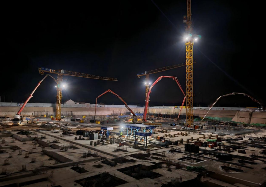 面對冬季低溫,團隊以“高標(biāo)準(zhǔn)、高效率、高安全”攻堅,300余名建設(shè)者多點同步推進鋼筋綁扎、混凝土澆筑,工序無縫銜接;管理人員駐守一線實時解決難題;安全交底100%覆蓋,堅守“無交底不作業(yè)”底線。塔吊24小時運轉(zhuǎn),罐車穿梭,燈火通明的現(xiàn)場繪出“星夜攻堅、使命必達”的實干畫卷。