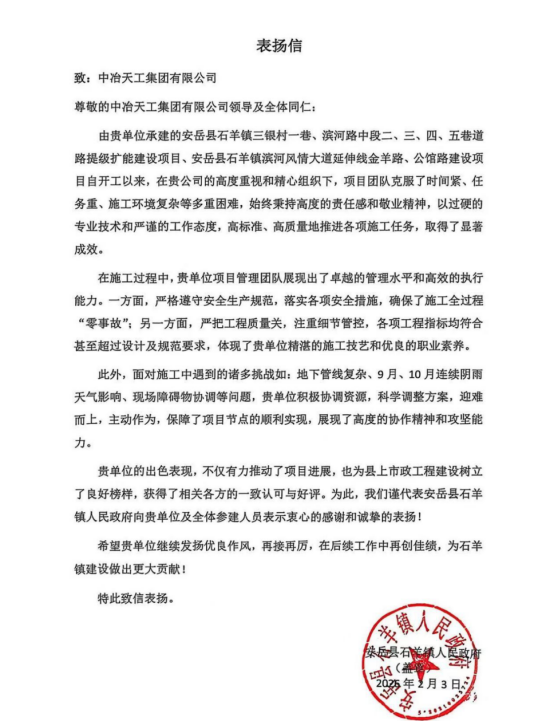 近日,城建公司四川省資陽市安岳縣石羊鎮(zhèn)建設(shè)項目收到安岳縣石羊鎮(zhèn)人民政府發(fā)來的一封感謝信。信中高度肯定了項目團隊在施工過程中精心組織、統(tǒng)籌規(guī)劃、攻堅克難,圓滿完成建設(shè)任務(wù)的擔當與成效,高度贊揚了中冶天工集團有限公司求真務(wù)實、銳意進取、勤于思考、敢于創(chuàng)新的工作作風,對項目團隊付出的努力表示敬意和感謝。